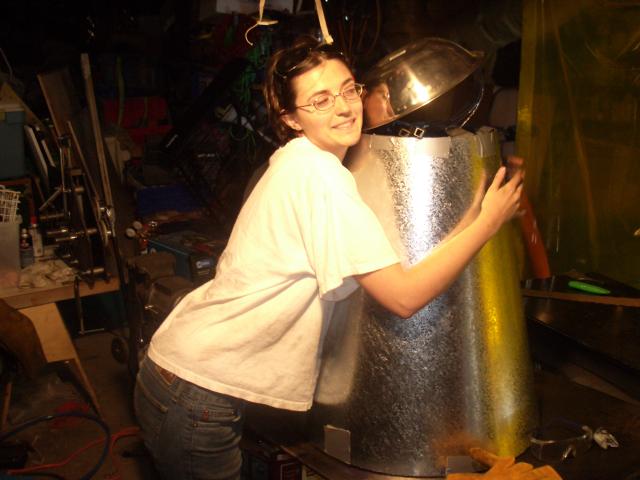 Here it is, the prototype. Note that the head isn't actually attached yet, which is why it looks a bit tilted. It does look amazingly Dalek-like: I suspect because the original Dalek design was driven by the same ease-of-fabrication constraints as us. We'll definitely have to stick a plunger on one of them and take some pictures.