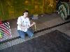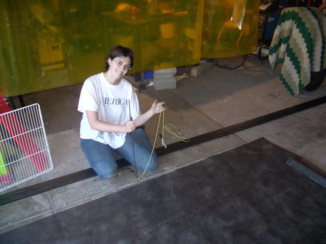 Once we knew the radii (radiuses?) to cut, we used a crude compass to draw a pattern on some landscaping cloth and cut it out. It fit! Go geometry (and go Stephen for doing most of the calculations). The test cloth doubles as a stylish skirt!