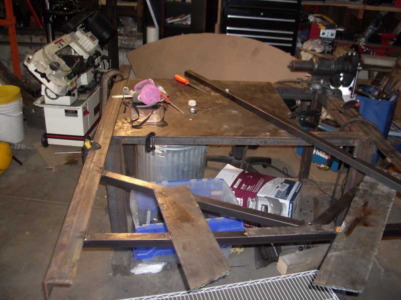 We built a rigid arm jig for the plasma cutter to do the actual cutting. We hacked together an extension for my work table and drilled a 1/2 inch hole in the table for the vertex of the swing-arm.