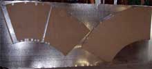 After a test-fitting, we transferred the pattern onto cardboard and fit the cardboard onto our sheet metal. You can see that two full cut-outs fit on one 4'x10' sheet of metal -- this was extremely important from a cost and ease-of-fabrication perspective.