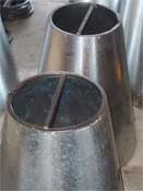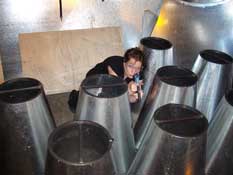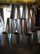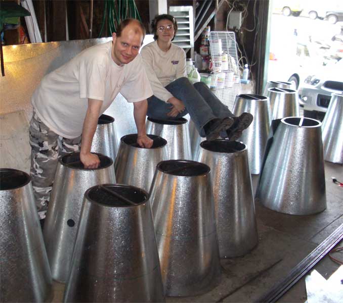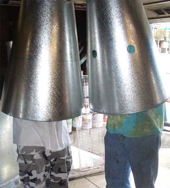 Tack-welding the prototype turned out to be ugly, dangerous (the galvanized sheet metal gives off noxious fumes when welded), and very difficult -- so we decided to use aluminium rivets to attach them to the base rings. Notice how much cleaner the rivets look in the top pawn compared to the welds on the bottom one.